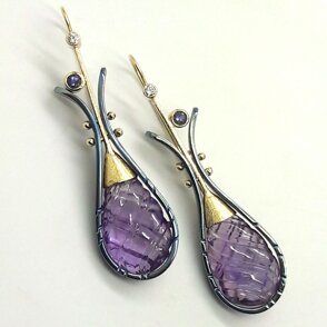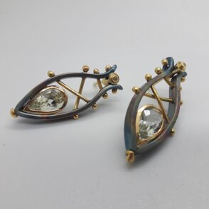 Orecchini in titanio e oro giallo 18kt, realizzati in tecnica diretta, con acquamarine taglio goccia e brillanti. Pezzo unico. Commissione